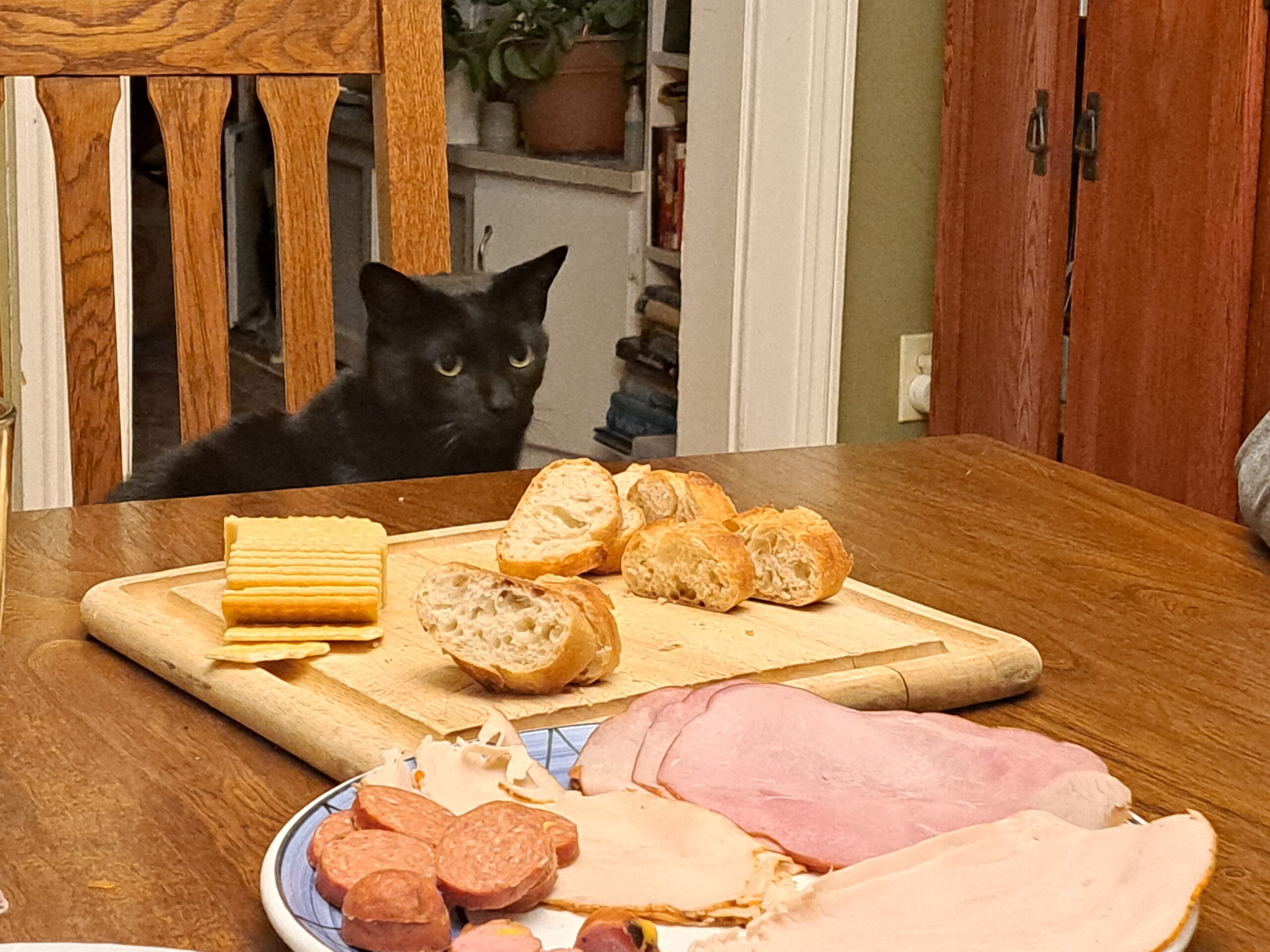 Then we had a “snicky snack” dinner of cheeses and olives and lunch meats. Here’s our cat, Dave, hoping that we’ll share some chicken with him.