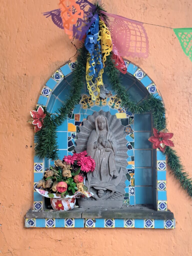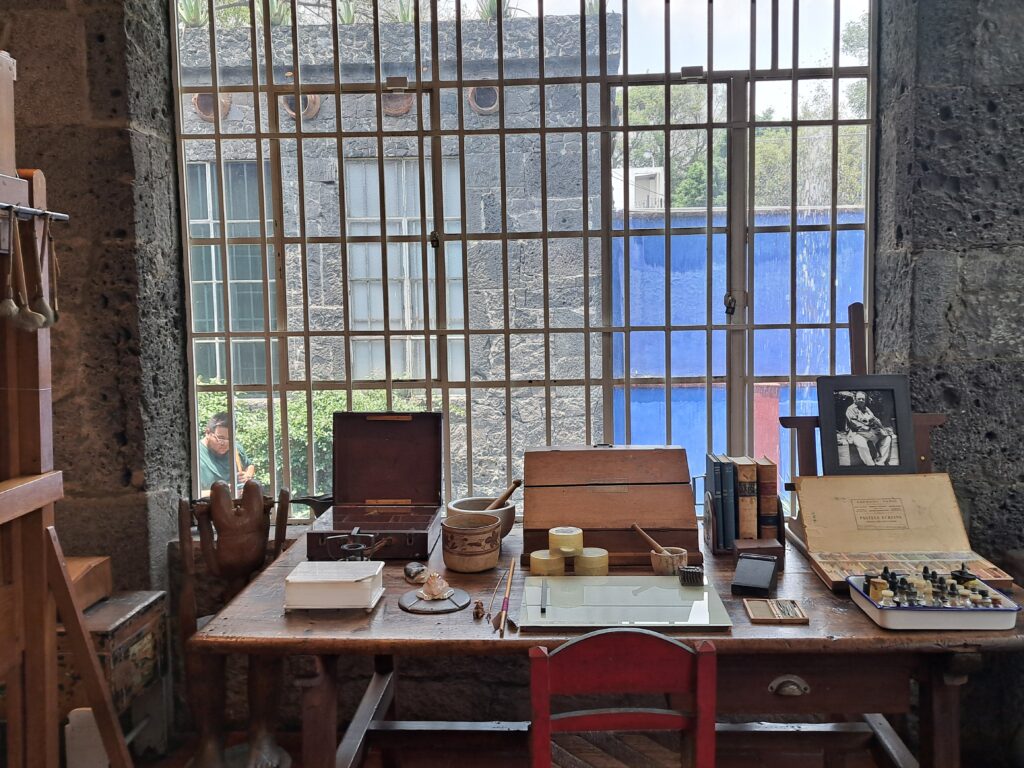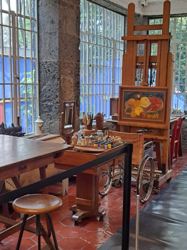 The next morning we headed to the Museo Frida Kahlo. This was her home, basically a little compound that included an inner courtyard as well as her living space and studio space. I somehow had never registered just how disabled Kahlo was, so seeing her accommodations, like the clothing she wore to help brace herself and the mirror above her bed so that she could paint self portraits while reclined, was really amazing. Plus it’s just cool to see her actual paints and brushes.