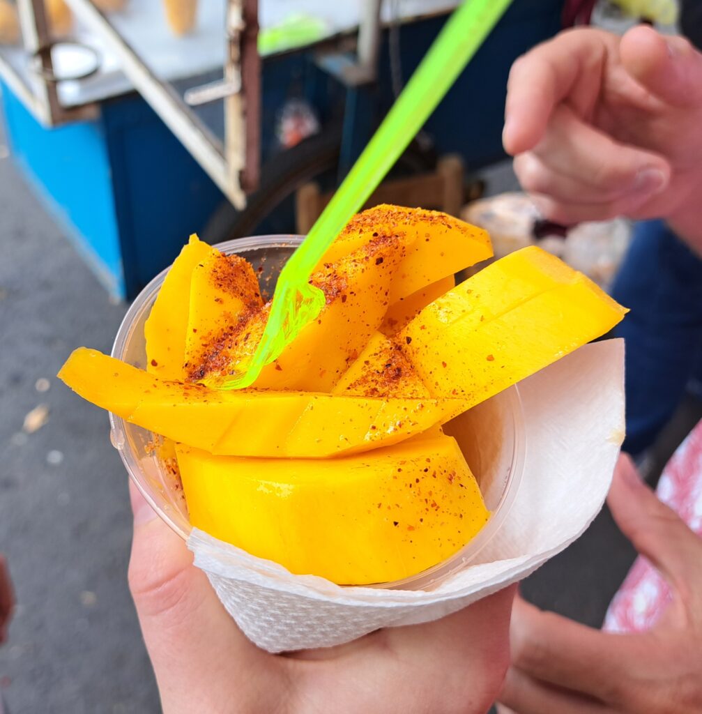 Next up: a quick snack, one of our favorites: fresh mango with Tajin.