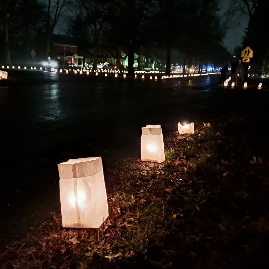 After the service, we were excited to check out the newly-expanded beautiful luminaries all over our neighborhood, thousands of them, including up and down our street. We took a short walk because that was all M could manage, but then the rest of us couldn’t resist a little bike ride to see more territory. It was a little cold (only a little since it’s still been unseasonably warm), but absolutely worth it. Even as we explored, G and I lamented to each other that there was absolutely no way to capture how lovely it was in a photograph. But that doesn’t mean we didn’t try (and yes, the picture in the middle is blurry, but the golden glow of the lighting is more accurate, so you’ll have to imagine the focus, the golden lights, and all of it going on the miles around to imagine what it was like.