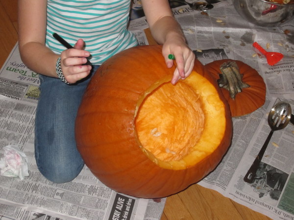 So the costumes were settled last week. Our weekend was busy, and we’d finally settled down by late Sunday afternoon, and we fully intended to lounge around, slob-like, with books and or football on tv, when Cute W and I realized that we hadn’t gotten around to getting pumpkins yet. D’oh! So the girls and I headed out to bag some pumpkins, and then they set to work carving while I roasted pumpkin seeds.