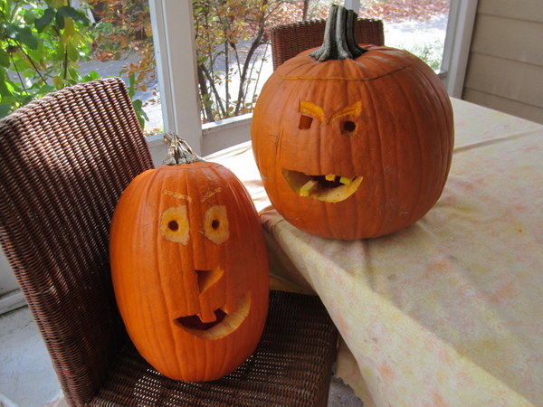 But the jack o’lanterns are ready! They’re staying in the screened porch for safety right now, because our neighborhood suffers from a population of particularly rapacious squirrels. And today I’ve picked up a pile of candy–we’re on a busy street–and so far I’ve managed to share the house with the candy for a good three hours without sampling. I’m going to try to stay strong.